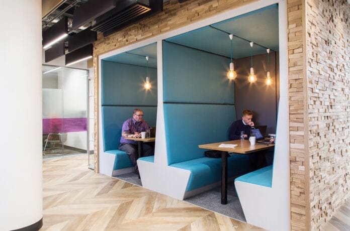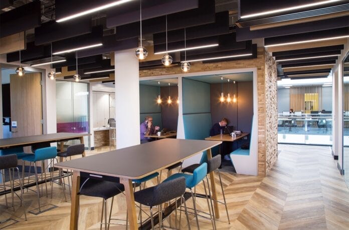 The main hub of the office was a “Community Hall” space which created a place for staff and visitors to mix informally rather than the more traditional “Business Lounge” facility, which often created a barrier between the two. This provided a central space for social activity and informal work areas, to bring people together and encourage them to move away from their desks.