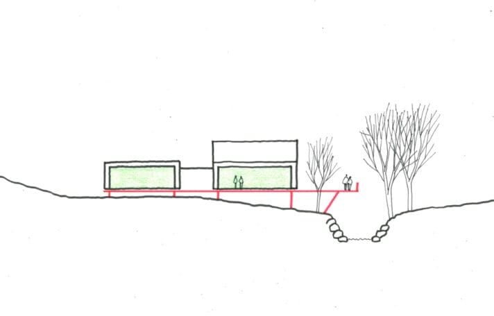 Accessed from a discrete high-level parking area the house is slowly revealed via a set of steps cut into the hillside following the edge of a fast-flowing stream down to the main entrance. The entrance hall separates the two cabins with the ‘living’ cabin to the west, and acts as a multi-purpose buffer between the two functions with through access directly to the south-east facing terrace. Large agricultural sliding timber barn doors shut off each area when required.