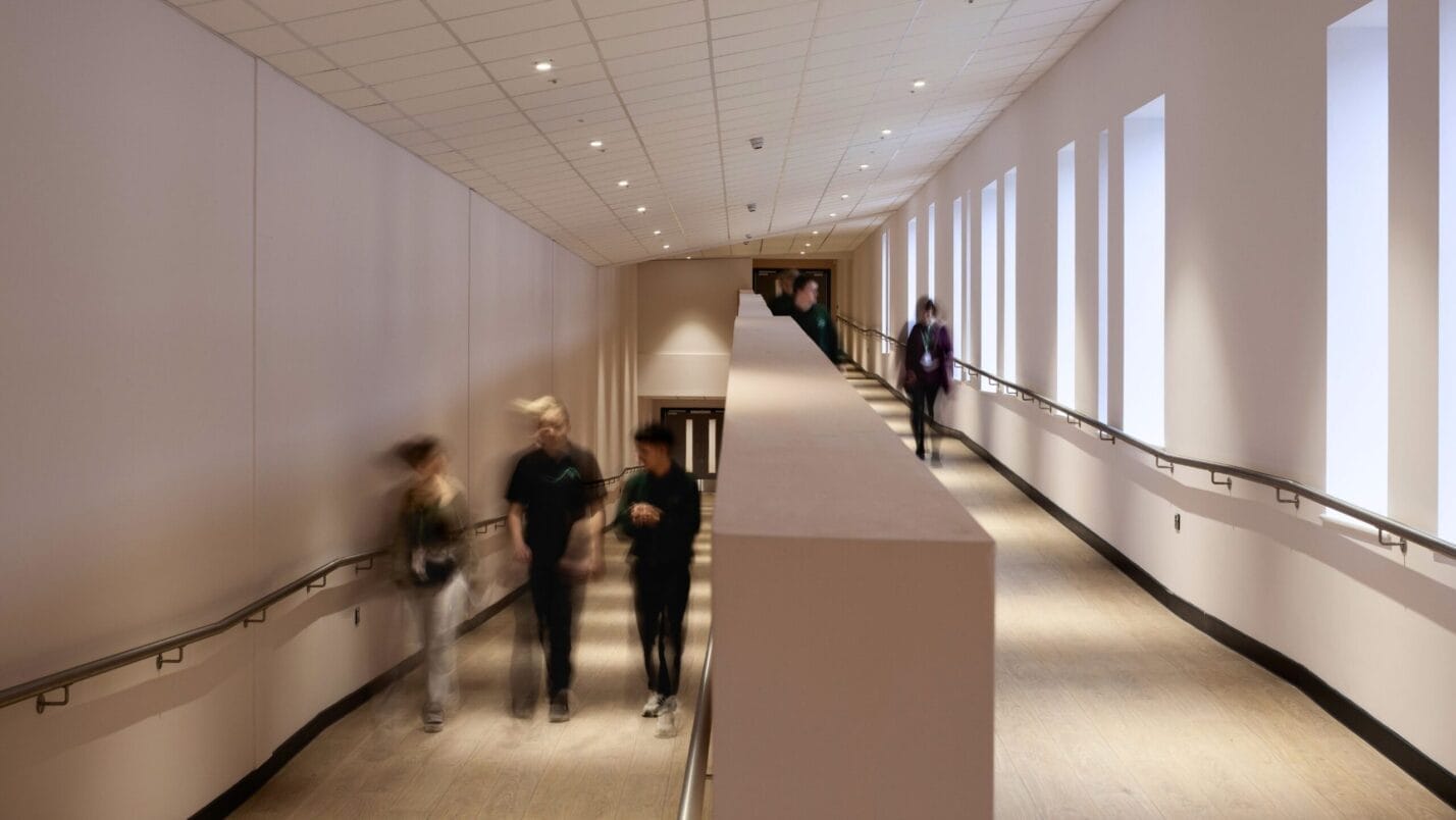 The building is organised around an easy to navigate, wide central corridor, connecting key areas of the school and providing separation where required. Flexible vertical circulation is supported by stair cores at each end of the two-storey wing, a large, accessible lift that can accommodate flat beds, and a thoughtfully integrated ramp extending from ground to first floor, ensuring accessibility and offering independence for pupils who cannot use stairs, without soley relying on lifts. The unique ramp also provides views over the courtyard and direct access to outdoor areas for secondary pupils; further enhancing the pupil experience.
